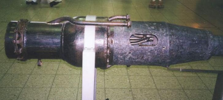 The combustion chamber and its outer casing. The double-walled combustion chamber is to the left, and the connections to the cooling jacket for the C-Stoff inlet and return pipes are at the top of the picture.