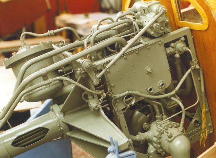 In this view of the starboard side of the motor, one can make out the four rivets which should secure the manufacturer's plate - missing on this motor. Also, the sectioned pump can just be seen, and a piece has been removed from the thrust tube, showing C-Stoff/T-Stoff fuel pipes leading to the combustion chamber.